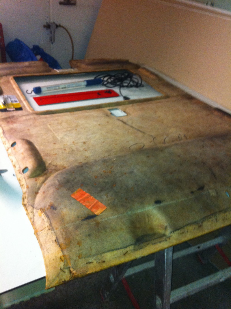 Möglichkeiten. 1. Zum Sattler und für 1000,-- Euro neu beziehen oder 2. Selber machen, mit Stoff beziehen oder lackieren. Wir entscheiden uns fürs Lackieren. At the beginning the headliner: It hangs like many other older Saabs. There are two possibilities. 1. To the saddler and for 1000, - Euro new cover or 2. Do it yourself, cover with fabric or paint. We decide to paint. |