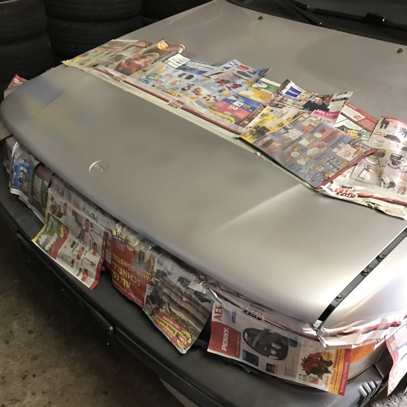 Wir haben die Farbe bestellt. Saab 200 metallic. Sie passte bestens. Aber wir können loslegen.